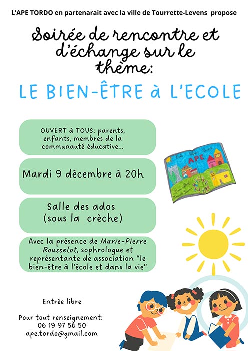 L’APE en partenariat avec la ville de Tourrette-Levens organise une soirée de rencontre et d’échange sur le bien-être à l’école menée par Marie-Pierre Rousselot sophrologue et représentant l’association « le bien-être à l’école et dans la vie ». le mardi 9 décembre à 20h salle des ados (à côté du conservatoire)