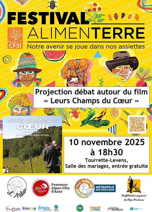 L'association Terre de Liens et l'AMAP de l'Atelier, avec le soutien de la Métropole de Nice, vous invitent pour une projection-débat autour du film "Leurs Champs du Coeur" dans le cadre du "Festival Alimenterre". Des témoignages touchants de 15 agriculteurs et agricultrices issus de toute la France qui nous parlent de leurs galères, des solutions possibles, et de la beauté de leur métier. La projection sera suivie d'échanges conviviaux en présence de plusieurs intervenants.