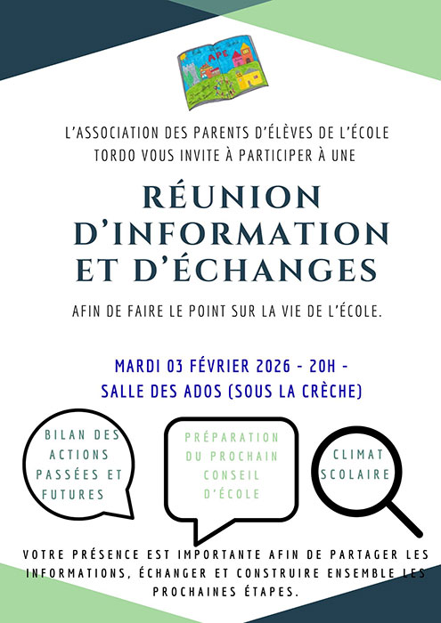 Auditorium école de musique 71 chemin Saint-Sébastien, Tourrette-LevensRéunion d'information et d'échanges avec l'APE Tordo