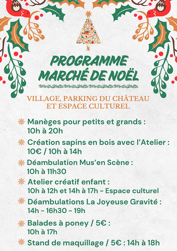 Retrouvez de nombreux stands sur le thème de Noël (décorations, produits gourmands, artisanat… ) ainsi que des animations, balades à poney, manèges, des ateliers créatifs pour enfants.