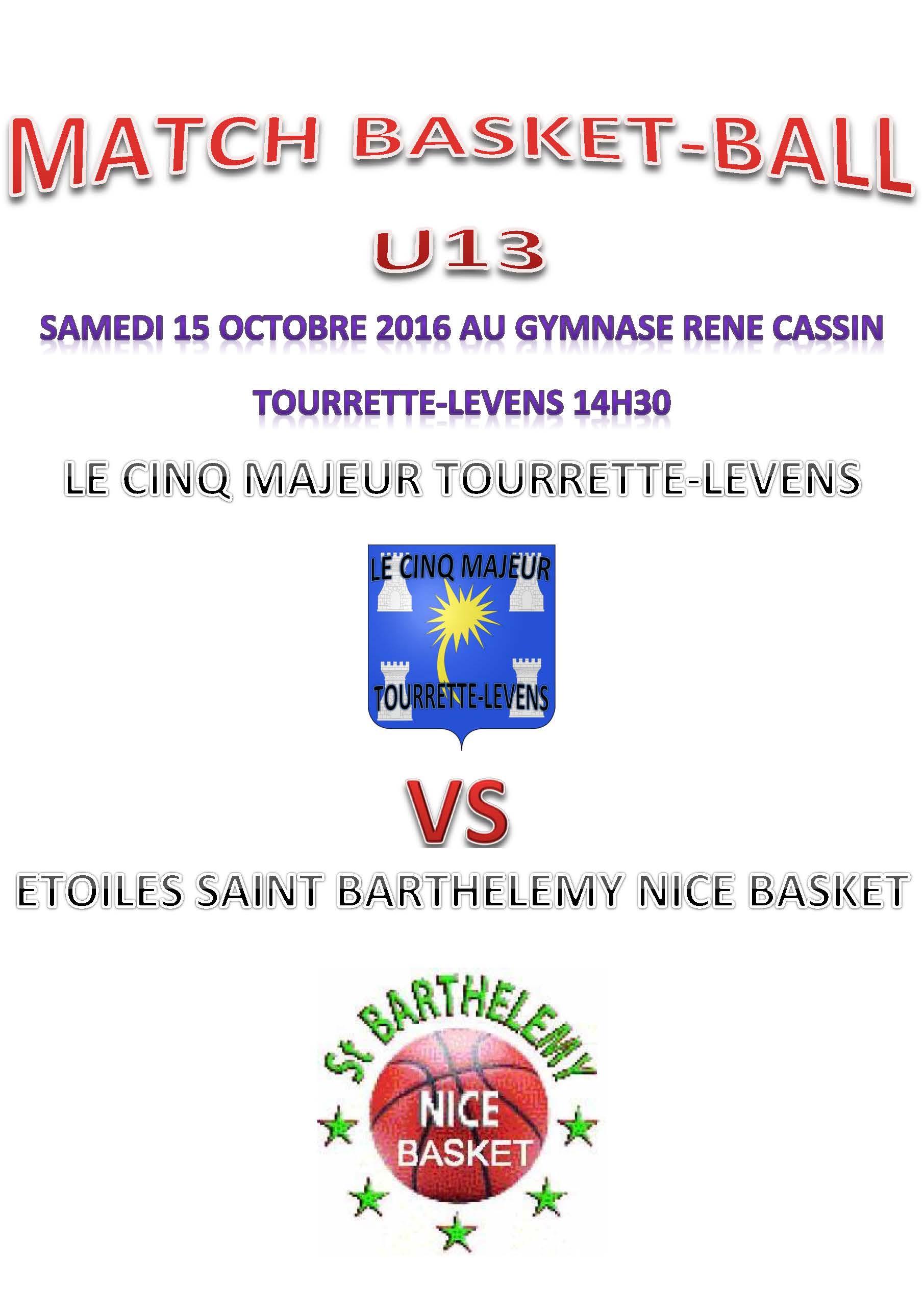 Samedi 15 octobre Match de Basket U13 Cinq Majeur Tourrette-Levens VS Etoile Saint Barthélémy Nice Basket 14h30 – Gymnase René Cassin